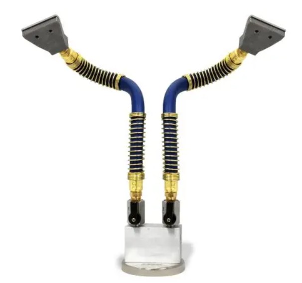 此外,EXAIR還提供磁性底座能與可繞性固定軟管及扁平噴嘴組合使用。磁性底座底部配有強力磁鐵,可牢固吸附於垂直或水平表面上,特別適合需經常移動吹氣位置的應用。磁性底座提供單孔與雙孔設計,每個孔位都有1/4閥門,可手動開關噴嘴。若需將此功能加入系統,只需參照型號編碼表進行選配即可,簡單又方便。