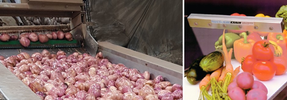 - 水果和蔬菜在採收後,大多需要經過清洗程序。EXAIR的超級風刀(Super Air Knives)常被應用於這些程序中。有時它們被用來吹掉像是洋蔥或馬鈴薯上的泥土,以免把清洗用的水變成泥漿。同樣也會用來吹掉洗淨和沖洗後的水分,讓作物在包裝或加工前盡可能乾燥。有一家客戶就是用超級風刀來做這件事。他們將原先的鼓風機換成 Model 110236SS的36吋不鏽鋼超級風刀套組來吹乾剛清洗過的馬鈴薯,因此能提高傳送帶的速度——風刀產生的層流氣流比鼓風機產生的紊流氣流更有效地將水分吹乾。而且,由於風刀的氣流溫度與環境溫度一致(它們以 40:1 的比例引入周圍空氣以輔助壓縮空氣),延長了馬鈴薯變質的時間。原本使用的鼓風機因旋轉元件摩擦產生較高溫的氣流,反而促進了細菌生長,加速了腐敗。