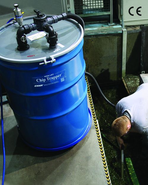 EXAIR 專利碎片過濾器提供了一個快速,簡單的方法來清理冷卻劑和其他液體的碎片及刨花。碎片過濾器吸取冷卻劑或液體內充滿了所有的固體碎片和進入一個可重複使用的過濾袋而攔截。只有液體泵退了出去。它是理想用於受污染的液體水槽,零件清洗機,儲存容積和儲存容器的機器上使用。專利碎片過濾器使用EXAIR的壓縮空氣動力包含油桶真空輸送器填充及抽空55加崙桶槽不到兩分鐘。只需設置 油桶真空輸送器和桶槽頂部的單向的流量控制閥,它可以快速真空液體與固體。一旦污水槽,坑或油箱是空的,泵的設置和泵出乾淨的冷卻液。所有的碎片和其他固體物進入重複使用的過濾袋而攔截。