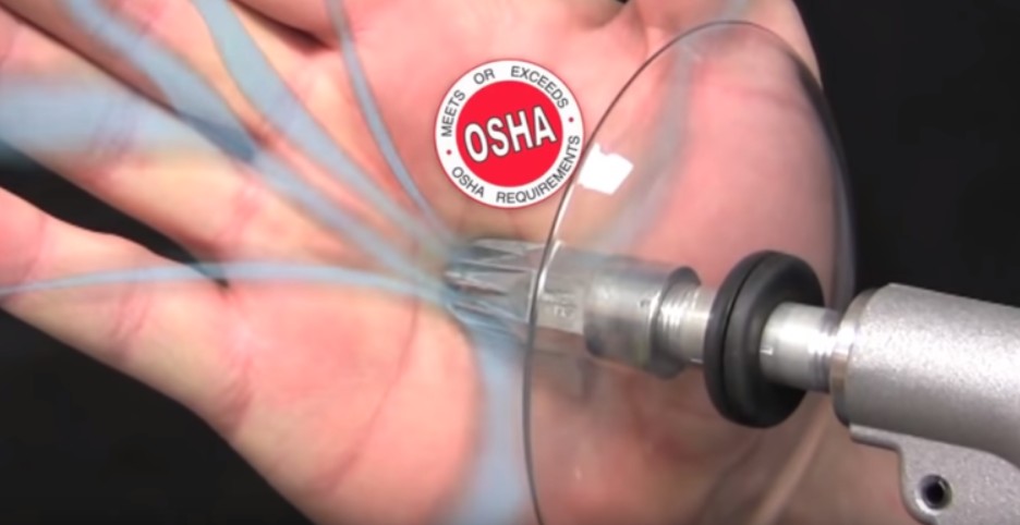 除了限制終端壓力以防止空氣栓塞外,OSHA 標準 1910.242(b) 還要求具備「有效的碎屑防護措施」,避免高速氣流吹起的碎屑擊中操作人員。這可以透過操作箱(如小型噴砂箱)、實體屏障(如耐衝擊玻璃、壓克力板、Lexan 等)或是個人防護裝備(如圍裙、長手套、面罩)來達成。若以上方式不可行,EXAIR 提供專為 VariBlast Precision、VariBlast Compact、Soft Grip、Heavy Duty 安全吹氣槍設計的 Chip Shields。這些是透明的聚碳酸酯圓盤,可沿著鋁製延長管前後移動,方便依據作業需求調整位置。
