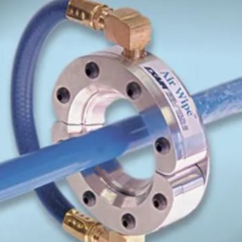 當客戶移除原來的鼓風機設備並將標準環形風刀連接到他們的壓縮空氣系統後,他們發現了一些顯著的改變。生產速度提高了約10%,達到了機器的最大速度。管子表面的水分幾乎被完全去除。他們還發現,標準環形風刀的噪音遠低於原先的鼓風機系統,約為82分貝(dBA),這使得操作員非常高興,因為鼓風機系統非常吵。而且,由於標準環形風刀沒有活動元件,它的維護需求也比鼓風機系統低,且占用的空間更小。此外,我們的環形風刀採用了分體設計,可以安裝在管子外圍,無需對擠出的長管進行切割。