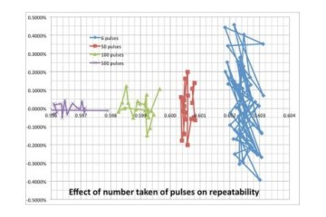 下面是一系列的結果顯示出操作以檢查重複性若干點和顯示採取不同脈衝數的重要性在500個脈衝。我們正在接近流量試驗台實現的可重複性。流量從每分鐘0.596到0.604升變化不大,但由於我們記錄到每升脈衝,這是一個線性傳感器二階影響。這個例子是從TITAN Atrato 超聲波傳感器採樣時間的約25毫秒,以便試圖測量僅6個脈衝將給予很差的重複性,每個成功的測量是僅略微不同。