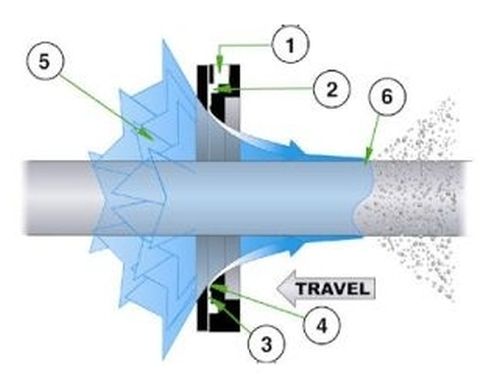 氣流附著到柯恩達空氣分布(4),它直接引導EXAIR 空氣擦拭器的氣流到環形的表面往下噴出。低壓區是在中心(5)誘導周圍的空氣產生高流量的氣流形成主要氣流。