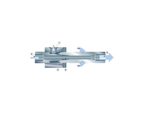 氣體膨脹並經過文氏管後增加速度(3)。真空氣流誘導下產生吸入作用(4)。真空入口吸取氣流混合主要氣流,然後在另一的端部排出的廢氣(5)。