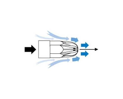 EXAIR 空氣噴嘴使用柯恩達效應來放大壓縮空氣流達25倍或更多。 如圖所示,壓縮空氣(黑色箭頭)通過在外側圓周的一系列噴嘴噴出。當空氣的行進方向沿噴嘴的外壁,誘導周圍的空氣(藍色箭頭)到氣流中。使用最小壓縮空氣耗氣量氣,主要氣流誘導產生高流量和高速疾風氣流。空氣是一直持續噴射出,因此可以安全地排放,遠低於OSHA終端壓力的需求時,噴嘴排出端將會賭塞。