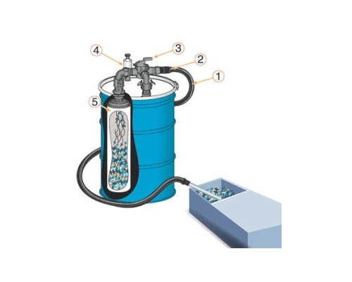 真空軟管(1)附著連到EXAIR 碎片過濾器的倒鉤的連接(2)。桶槽上方的頂端有方向性流量控制閥(3)和EXAIR 碎片過濾器的旋鈕(4)設定為“填充”位置。壓縮空氣的壓力80-100 PSIG(5.5-6.9BAR)供給,允許打開關斷閥使壓縮空氣在流經EXAIR碎片過濾器輸送液體通過可撓性軟管到可重複使用過濾帶(5)。設定桶槽上方的流量控制閥和EXAIR 碎片過濾器的旋鈕設定為“空”的位置,並打開壓縮空氣源供給關斷閥後,然後該過濾後的’液體會經由可撓性軟管送回。一旦打開壓縮空氣供給源時,當所有固體留在可重複使用的過濾袋,壓縮空氣會將液體推回通過軟管。
