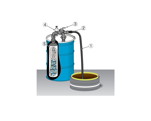 真空軟管(1)附著連到EXAIR 高揚程碎片過濾器的倒鉤的連接(2)。桶槽上方的頂端有方向性流量控制閥(3)和EXAIR 高揚程碎片過濾器的旋鈕(4)設定為“填充”位置。壓縮空氣的壓力80-100 PSIG(5.5-6.9BAR)供給,允許打開關斷閥使壓縮空氣在流經EXAIR碎片過濾器輸送液體通過可撓性軟管到可重複使用過濾帶(5)。設定桶槽上方的流量控制閥和EXAIR 高揚程碎片過濾器的旋鈕設定為“空”的位置,並打開壓縮空氣源供給關斷閥後,然後該過濾後的’液體會經由可撓性軟管送回。一旦打開壓縮空氣供給源時,當所有固體留在可重複使用的過濾袋,壓縮空氣會將液體推回通過軟管。
