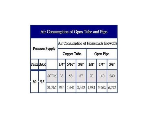 現有1/8"(3.2mm)圓管的吹排系統在80 PSIG(5.5 BAR)壓力供給,空氣耗氣量,從上面表為70 SCFM(1981 SLPM)。