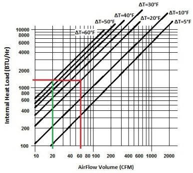 例如,對於1300BTU / hr的內部熱負荷,為了確保控制盤內的溫升(從周圍溫度)不超過20°F,需要60.5CFM的氣流(上述紅線)。指定風扇的風量的等級CFM的並安裝控制盤面板內。