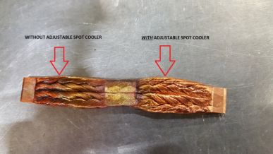 此設置的結果如上圖所示。左邊是沒有使用可調溫低溫冷卻槍的冷卻過程的輸出(這種銅質量不能進行質量控制檢查),右側是相同過程的輸出,但是可調溫低溫冷卻槍的冷卻。右側的銅焊接,冷卻,並通過質量控制檢查,無需使用液體冷卻。