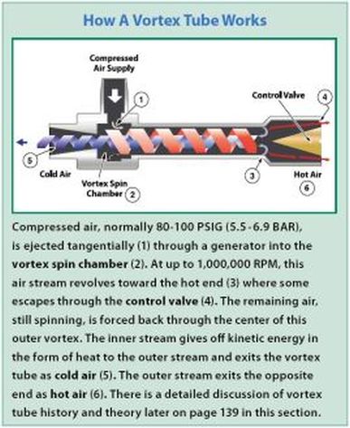 渦流管使用壓縮空氣來產生冷空氣流和熱空氣流。當壓縮空氣進入迷你冷卻槍時,它通過一個旋轉室,該旋轉室以高達1,000,000 RPM的速度旋轉,產生的溫度範圍為-50°F至+ 260°F,並提供冷卻能力高達10,200 Btu / hr。在不虛需要維修和沒有活動零件的情況下,它們在大型和小型冷卻製程應用中變得相當流行,取代更傳統的冷卻方法。