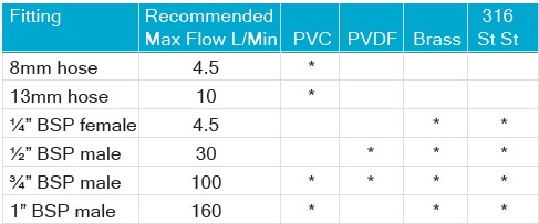 在下表顯示最大標準流量搭配的管徑及材質,可依下列規範參酌自身需求選擇。
